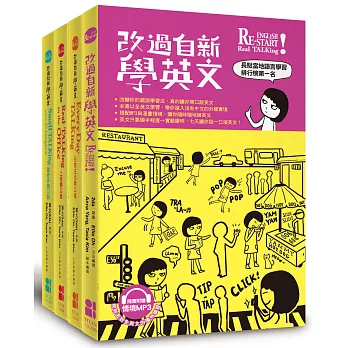 此套書包含《改過自新學英文(隨書附情境MP3)》《改過自新學英文:Every Day TALKing日常生活開口篇》《改過自新學英文:Real TALKing in the Office上班開口說》《改過自新學英文:Small TALKing with Strangers跟老外開口說》,共四冊。